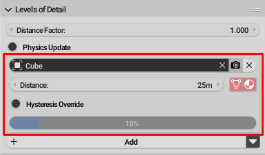 Level of detail settings can be found in the Object settings when the renderer is set to RanGE Game. In the Levels of Detail panel is a button to add a new level of detail to the current object. The settings for each level of detail are displayed in its own box. The exception to this is the base level of detail. This is automatically setup as the current object with a distance setting of 0. To remove a level of detail, click on the X button in the top right corner of the box of the level to be removed.